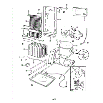 Plastic defrost pan. Evaporator pan hangs from side rails and rests on compressor.
