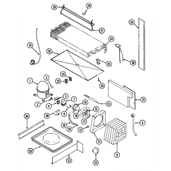 Plastic defrost pan. Evaporator pan hangs from side rails and rests on compressor.
