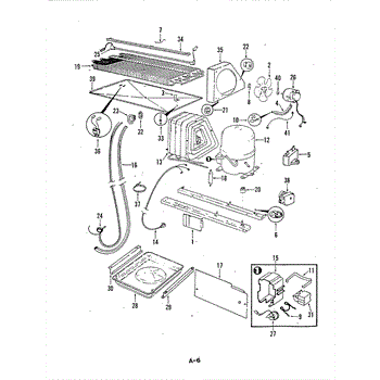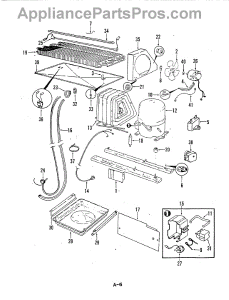 Plastic defrost pan. Evaporator pan hangs from side rails and rests on compressor.