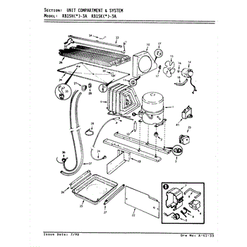 Plastic defrost pan. Evaporator pan hangs from side rails and rests on compressor.
