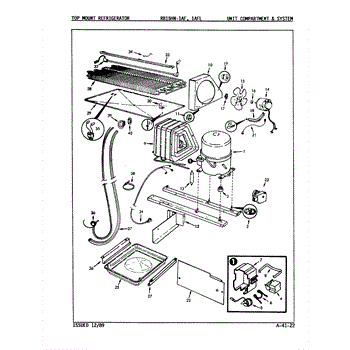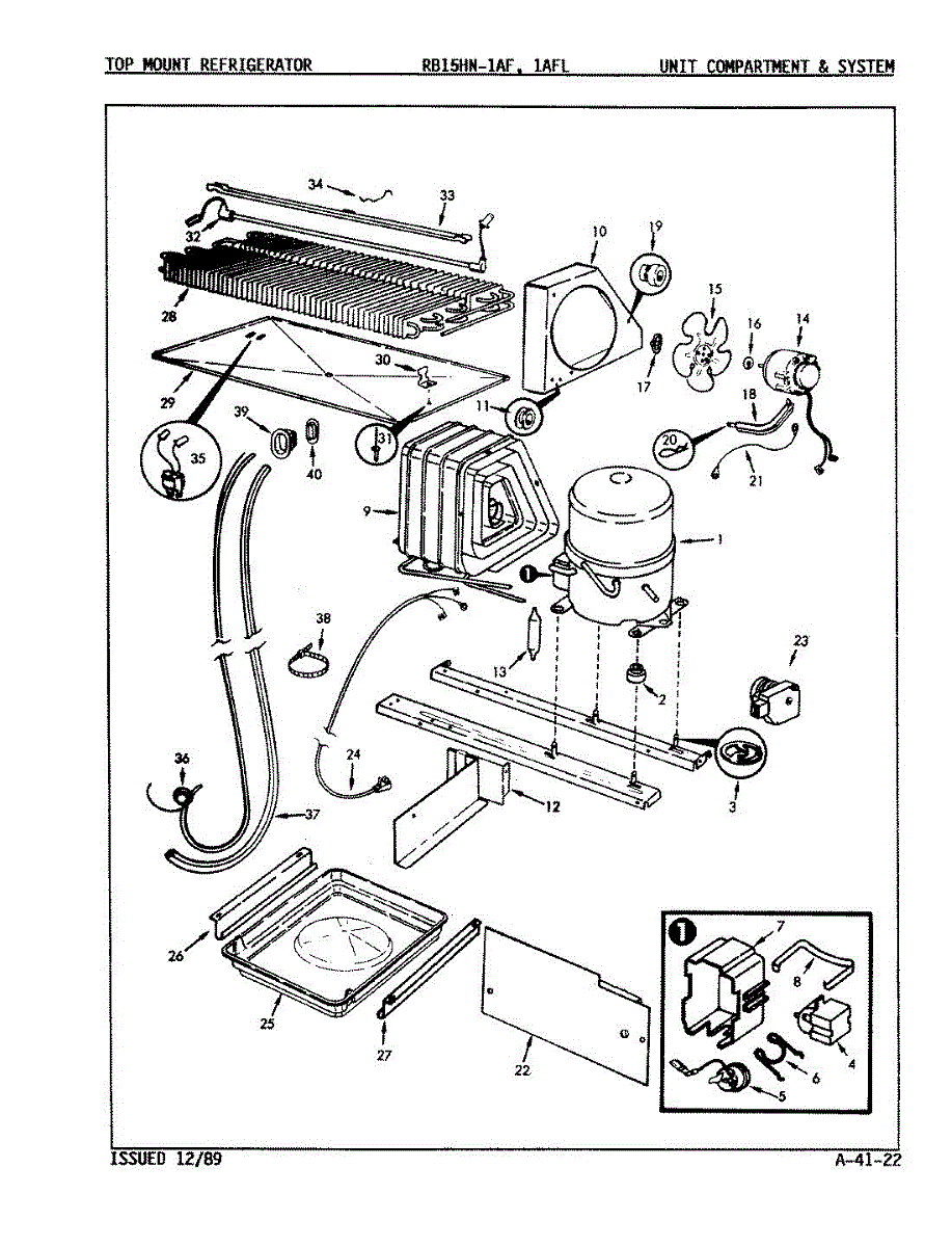 Plastic defrost pan. Evaporator pan hangs from side rails and rests on compressor.