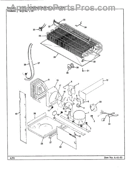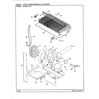 Plastic defrost pan. Evaporator pan hangs from side rails and rests on compressor.