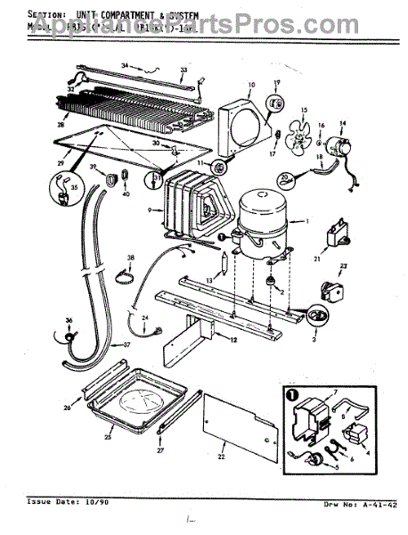 Plastic defrost pan. Evaporator pan hangs from side rails and rests on compressor.