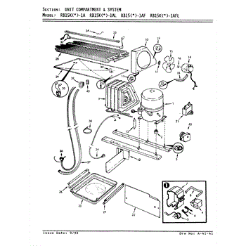 Plastic defrost pan. Evaporator pan hangs from side rails and rests on compressor.