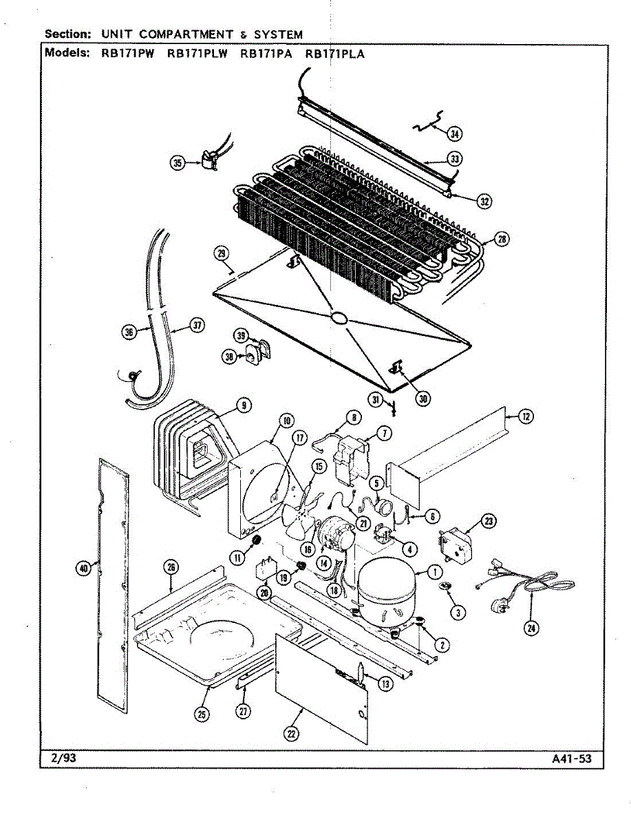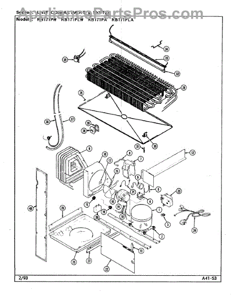 Plastic defrost pan. Evaporator pan hangs from side rails and rests on compressor.