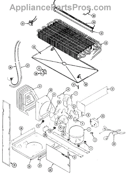 Plastic defrost pan. Evaporator pan hangs from side rails and rests on compressor.