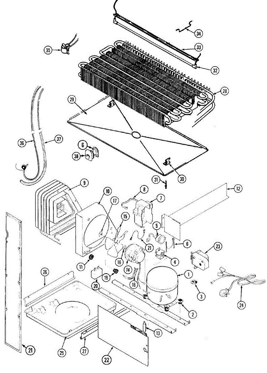 Plastic defrost pan. Evaporator pan hangs from side rails and rests on compressor.