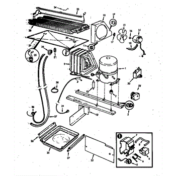Plastic defrost pan. Evaporator pan hangs from side rails and rests on compressor.