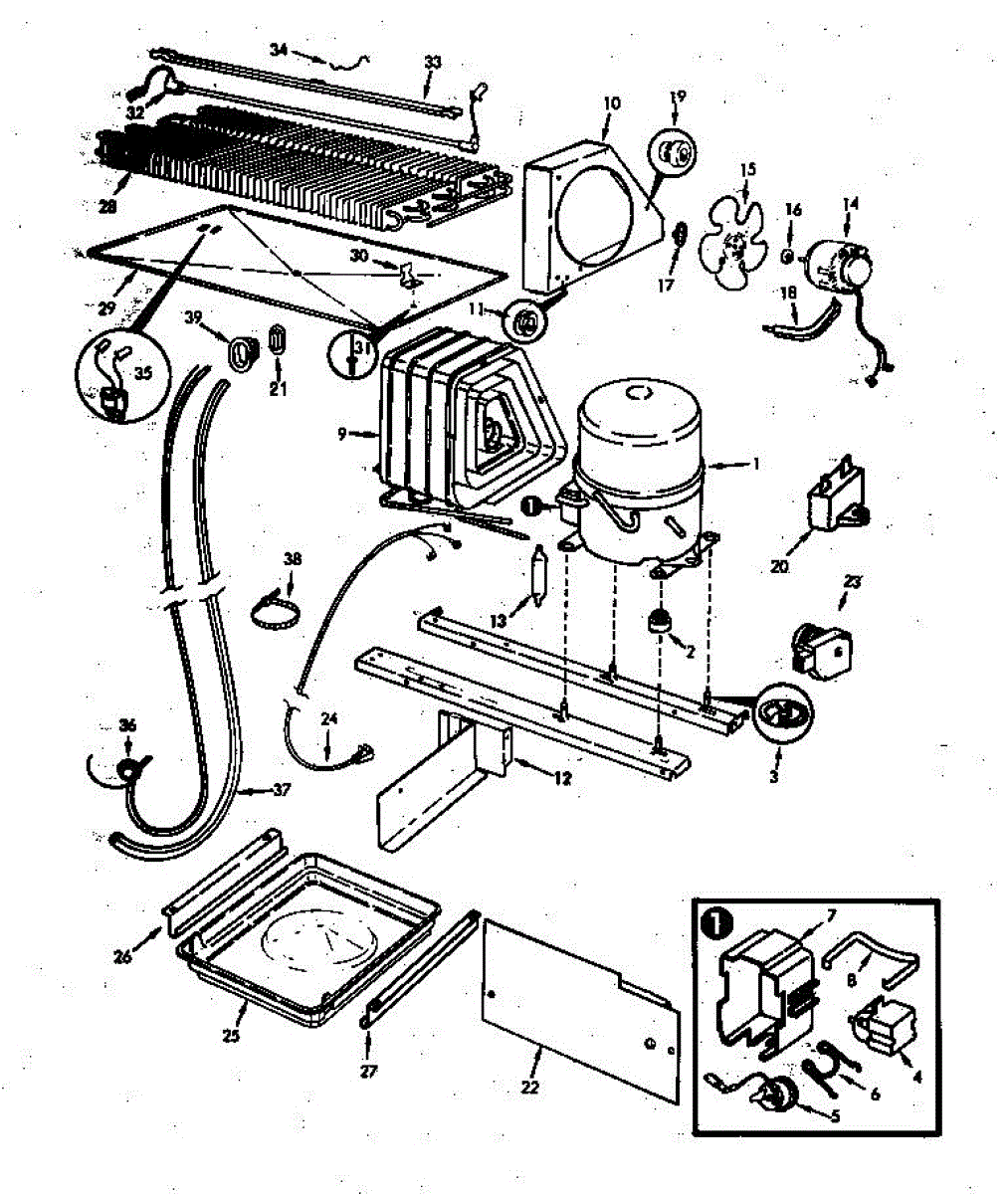 Plastic defrost pan. Evaporator pan hangs from side rails and rests on compressor.
