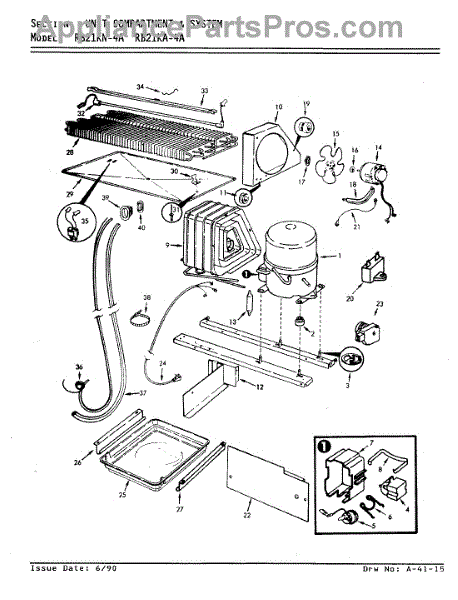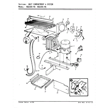 Plastic defrost pan. Evaporator pan hangs from side rails and rests on compressor.