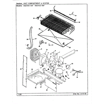 Plastic defrost pan. Evaporator pan hangs from side rails and rests on compressor.