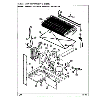 Plastic defrost pan. Evaporator pan hangs from side rails and rests on compressor.