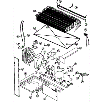 Plastic defrost pan. Evaporator pan hangs from side rails and rests on compressor.