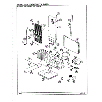 Plastic defrost pan. Evaporator pan hangs from side rails and rests on compressor.
