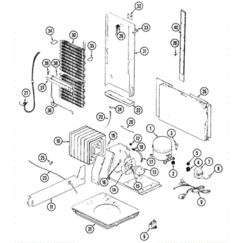 Plastic defrost pan. Evaporator pan hangs from side rails and rests on compressor.