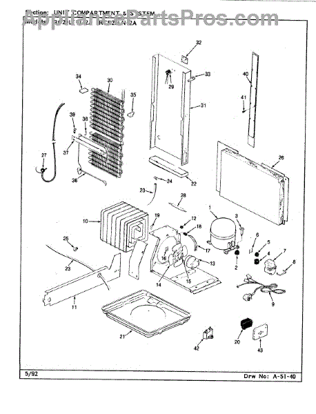 Plastic defrost pan. Evaporator pan hangs from side rails and rests on compressor.