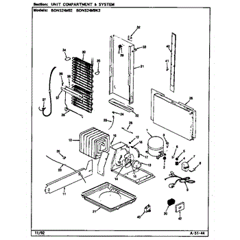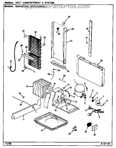 Plastic defrost pan. Evaporator pan hangs from side rails and rests on compressor.