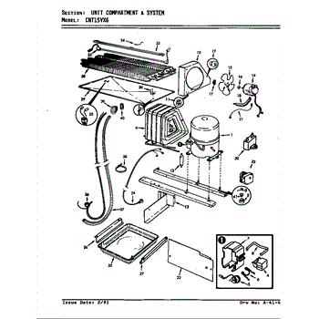 Plastic defrost pan. Evaporator pan hangs from side rails and rests on compressor.