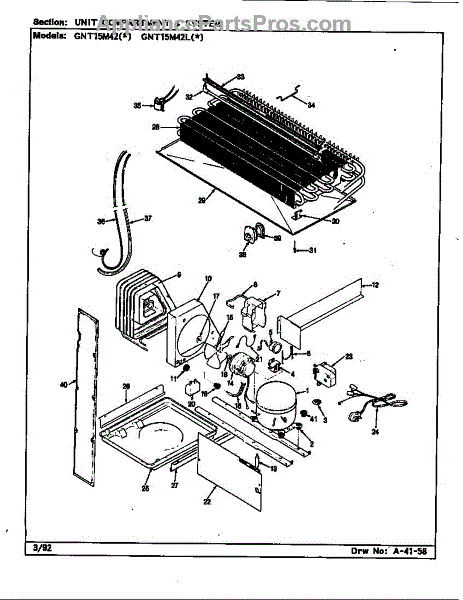 Plastic defrost pan. Evaporator pan hangs from side rails and rests on compressor.