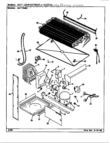 Plastic defrost pan. Evaporator pan hangs from side rails and rests on compressor.