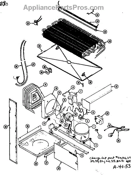 Plastic defrost pan. Evaporator pan hangs from side rails and rests on compressor.