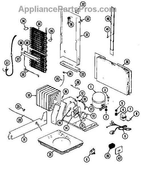 Plastic defrost pan. Evaporator pan hangs from side rails and rests on compressor.