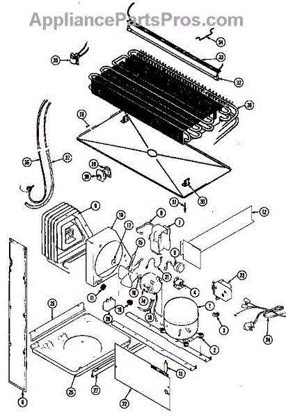 Plastic defrost pan. Evaporator pan hangs from side rails and rests on compressor.