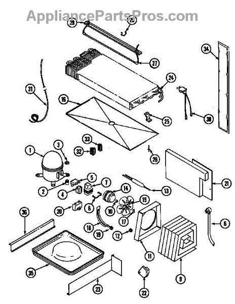 Plastic defrost pan. Evaporator pan hangs from side rails and rests on compressor.