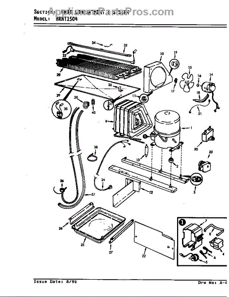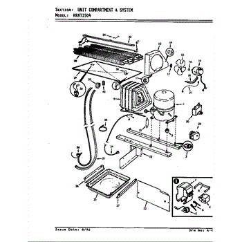 Plastic defrost pan. Evaporator pan hangs from side rails and rests on compressor.