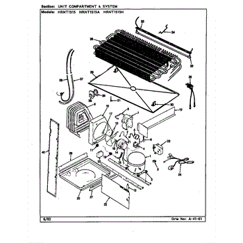Plastic defrost pan. Evaporator pan hangs from side rails and rests on compressor.