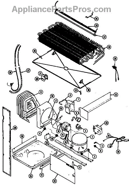 Plastic defrost pan. Evaporator pan hangs from side rails and rests on compressor.
