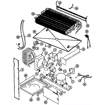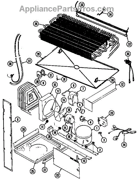 Plastic defrost pan. Evaporator pan hangs from side rails and rests on compressor.