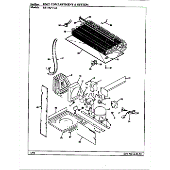 Plastic defrost pan. Evaporator pan hangs from side rails and rests on compressor.