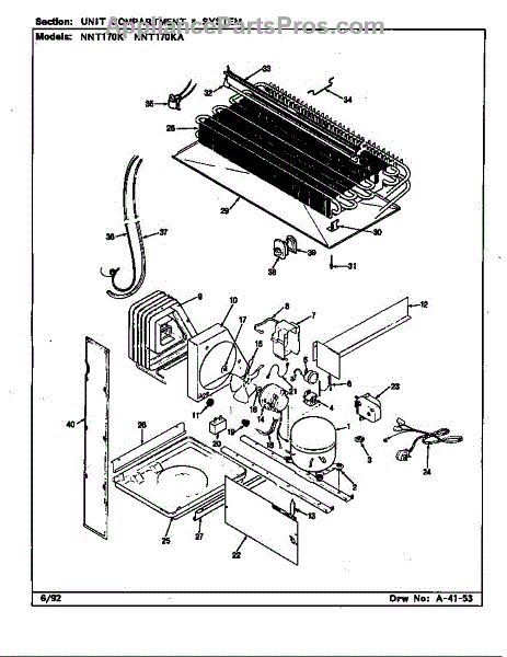 Plastic defrost pan. Evaporator pan hangs from side rails and rests on compressor.