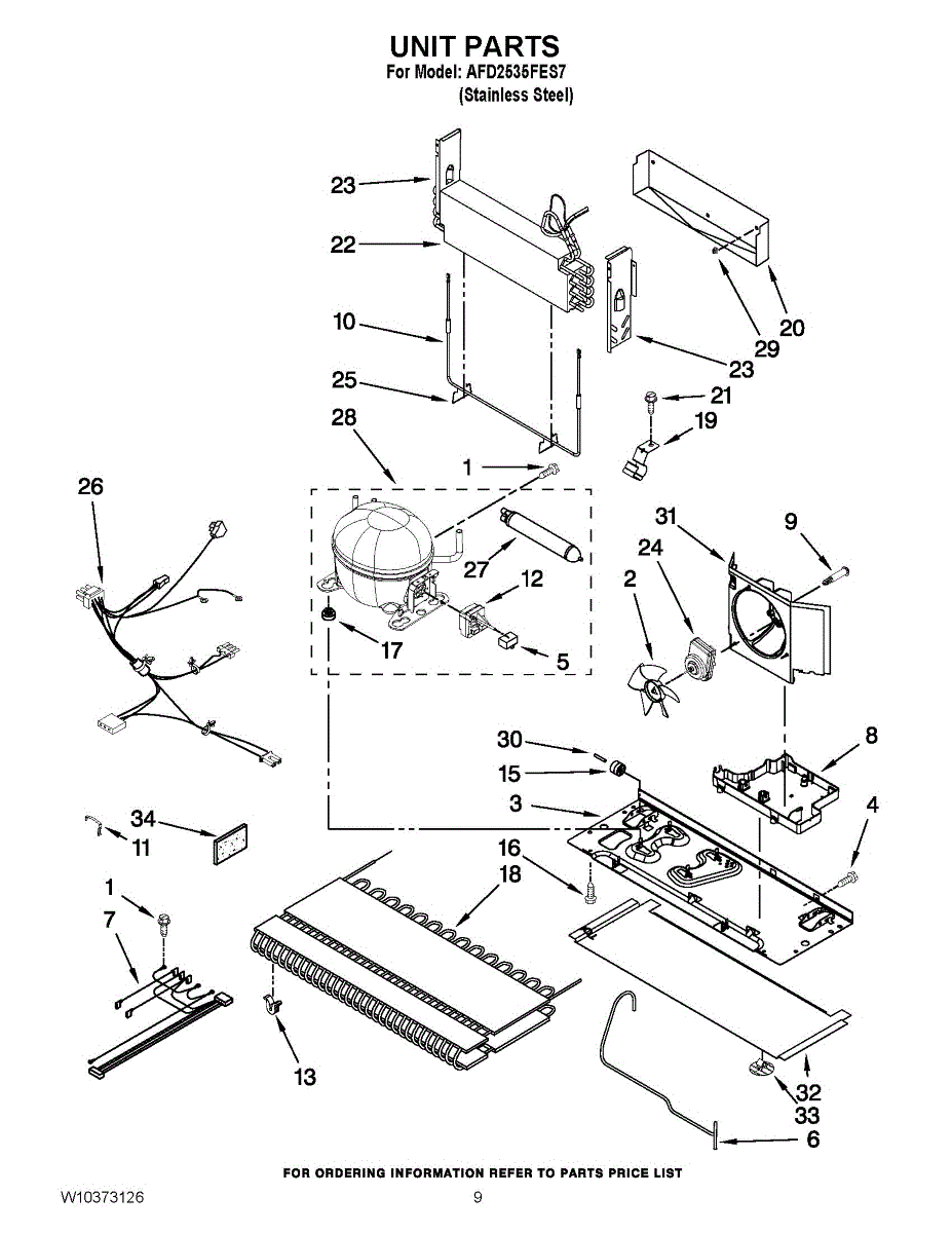 Wire harness for refrigerator freezer compartment. Connects to defrost heater, evaporator fan, and sensors. Replace if damaged, melted, or corroded.