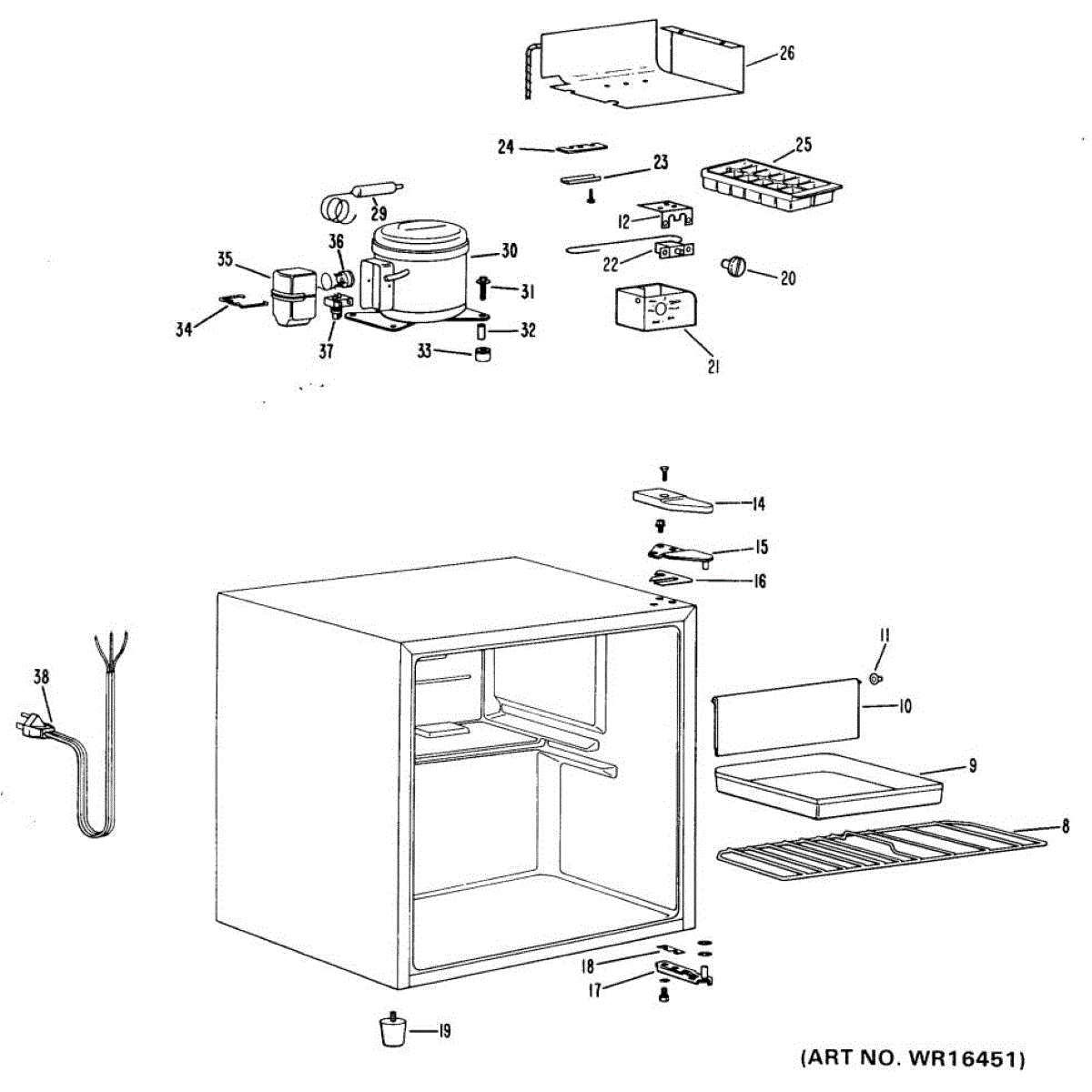 Supplies electrical power from wall outlet to refrigerator. Replace this cord if cut, frayed, overheated, or damaged to restore safe electrical connection.