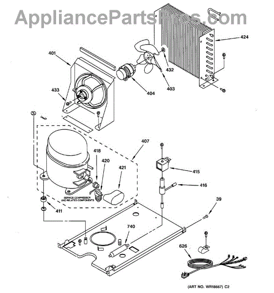• Works with the condenser fan motor assembly to move heat away from the compressor area