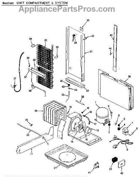 Plastic defrost pan. Evaporator pan hangs from side rails and rests on compressor.