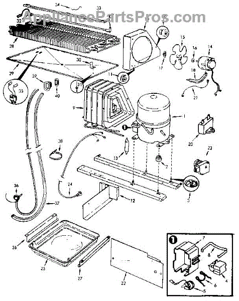Plastic defrost pan. Evaporator pan hangs from side rails and rests on compressor.