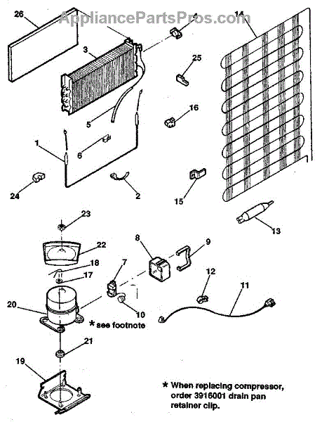 This is a compressor used in several types of home appliances. The compressor is designed to take cold gas in the appliance and place it under pressure so the gas raises in temperature. It is then moved through the refrigerator system to ensure the unit stays cold throughout the appliance. This part can become damaged or malfunction, which may cause the motor to stop running, make the motor noisier, or cause the motor to never stop running.If this happens, the compressor will need to be replaced. A basic set of tools will be needed. A pair of work gloves can also be useful. First, locate the compressor as it may be in various locations depending on the appliance model. Unplug the appliance before removing the compressor. Install the new compressor using the original bolts and nuts before turning the power back on and resuming normal use.This part is sold on an individual basis. The compressor is made to be used with refrigerators, ranges, stoves, ovens, air conditioners, and freezers created by Gibson, Frigidaire, Kelvinator, Montgomery Wards, Westinghouse, Tappan, JCPenney, Universal, and Kenmore. It is an authentic OEM replacement part directly sourced from the manufacturer.