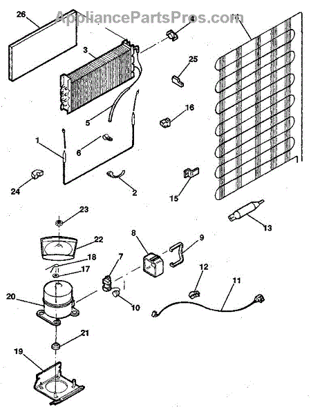 This is a compressor used in several types of home appliances. The compressor is designed to take cold gas in the appliance and place it under pressure so the gas raises in temperature. It is then moved through the refrigerator system to ensure the unit stays cold throughout the appliance. This part can become damaged or malfunction, which may cause the motor to stop running, make the motor noisier, or cause the motor to never stop running.If this happens, the compressor will need to be replaced. A basic set of tools will be needed. A pair of work gloves can also be useful. First, locate the compressor as it may be in various locations depending on the appliance model. Unplug the appliance before removing the compressor. Install the new compressor using the original bolts and nuts before turning the power back on and resuming normal use.This part is sold on an individual basis. The compressor is made to be used with refrigerators, ranges, stoves, ovens, air conditioners, and freezers created by Gibson, Frigidaire, Kelvinator, Montgomery Wards, Westinghouse, Tappan, JCPenney, Universal, and Kenmore. It is an authentic OEM replacement part directly sourced from the manufacturer.