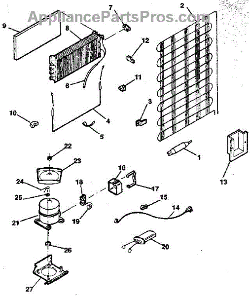 This is a compressor used in several types of home appliances. The compressor is designed to take cold gas in the appliance and place it under pressure so the gas raises in temperature. It is then moved through the refrigerator system to ensure the unit stays cold throughout the appliance. This part can become damaged or malfunction, which may cause the motor to stop running, make the motor noisier, or cause the motor to never stop running.If this happens, the compressor will need to be replaced. A basic set of tools will be needed. A pair of work gloves can also be useful. First, locate the compressor as it may be in various locations depending on the appliance model. Unplug the appliance before removing the compressor. Install the new compressor using the original bolts and nuts before turning the power back on and resuming normal use.This part is sold on an individual basis. The compressor is made to be used with refrigerators, ranges, stoves, ovens, air conditioners, and freezers created by Gibson, Frigidaire, Kelvinator, Montgomery Wards, Westinghouse, Tappan, JCPenney, Universal, and Kenmore. It is an authentic OEM replacement part directly sourced from the manufacturer.