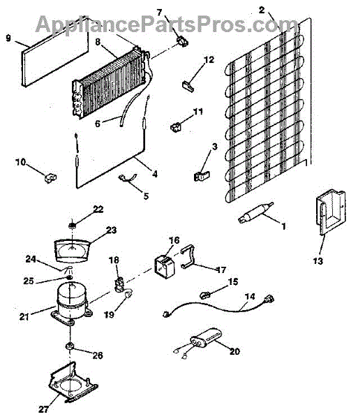 This is a compressor used in several types of home appliances. The compressor is designed to take cold gas in the appliance and place it under pressure so the gas raises in temperature. It is then moved through the refrigerator system to ensure the unit stays cold throughout the appliance. This part can become damaged or malfunction, which may cause the motor to stop running, make the motor noisier, or cause the motor to never stop running.If this happens, the compressor will need to be replaced. A basic set of tools will be needed. A pair of work gloves can also be useful. First, locate the compressor as it may be in various locations depending on the appliance model. Unplug the appliance before removing the compressor. Install the new compressor using the original bolts and nuts before turning the power back on and resuming normal use.This part is sold on an individual basis. The compressor is made to be used with refrigerators, ranges, stoves, ovens, air conditioners, and freezers created by Gibson, Frigidaire, Kelvinator, Montgomery Wards, Westinghouse, Tappan, JCPenney, Universal, and Kenmore. It is an authentic OEM replacement part directly sourced from the manufacturer.