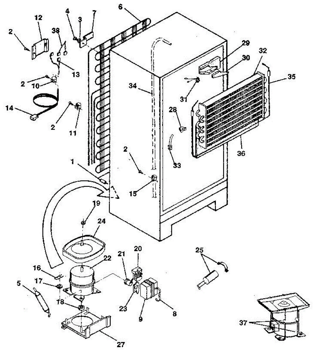 This is a compressor used in several types of home appliances. The compressor is designed to take cold gas in the appliance and place it under pressure so the gas raises in temperature. It is then moved through the refrigerator system to ensure the unit stays cold throughout the appliance. This part can become damaged or malfunction, which may cause the motor to stop running, make the motor noisier, or cause the motor to never stop running.If this happens, the compressor will need to be replaced. A basic set of tools will be needed. A pair of work gloves can also be useful. First, locate the compressor as it may be in various locations depending on the appliance model. Unplug the appliance before removing the compressor. Install the new compressor using the original bolts and nuts before turning the power back on and resuming normal use.This part is sold on an individual basis. The compressor is made to be used with refrigerators, ranges, stoves, ovens, air conditioners, and freezers created by Gibson, Frigidaire, Kelvinator, Montgomery Wards, Westinghouse, Tappan, JCPenney, Universal, and Kenmore. It is an authentic OEM replacement part directly sourced from the manufacturer.