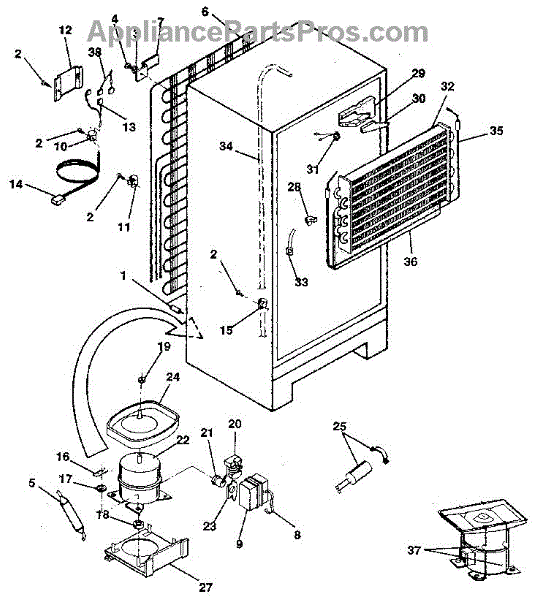 This is a compressor used in several types of home appliances. The compressor is designed to take cold gas in the appliance and place it under pressure so the gas raises in temperature. It is then moved through the refrigerator system to ensure the unit stays cold throughout the appliance. This part can become damaged or malfunction, which may cause the motor to stop running, make the motor noisier, or cause the motor to never stop running.If this happens, the compressor will need to be replaced. A basic set of tools will be needed. A pair of work gloves can also be useful. First, locate the compressor as it may be in various locations depending on the appliance model. Unplug the appliance before removing the compressor. Install the new compressor using the original bolts and nuts before turning the power back on and resuming normal use.This part is sold on an individual basis. The compressor is made to be used with refrigerators, ranges, stoves, ovens, air conditioners, and freezers created by Gibson, Frigidaire, Kelvinator, Montgomery Wards, Westinghouse, Tappan, JCPenney, Universal, and Kenmore. It is an authentic OEM replacement part directly sourced from the manufacturer.