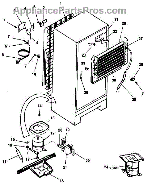 This is a compressor used in several types of home appliances. The compressor is designed to take cold gas in the appliance and place it under pressure so the gas raises in temperature. It is then moved through the refrigerator system to ensure the unit stays cold throughout the appliance. This part can become damaged or malfunction, which may cause the motor to stop running, make the motor noisier, or cause the motor to never stop running.If this happens, the compressor will need to be replaced. A basic set of tools will be needed. A pair of work gloves can also be useful. First, locate the compressor as it may be in various locations depending on the appliance model. Unplug the appliance before removing the compressor. Install the new compressor using the original bolts and nuts before turning the power back on and resuming normal use.This part is sold on an individual basis. The compressor is made to be used with refrigerators, ranges, stoves, ovens, air conditioners, and freezers created by Gibson, Frigidaire, Kelvinator, Montgomery Wards, Westinghouse, Tappan, JCPenney, Universal, and Kenmore. It is an authentic OEM replacement part directly sourced from the manufacturer.