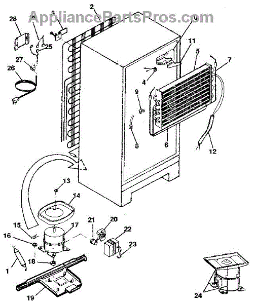 This is a compressor used in several types of home appliances. The compressor is designed to take cold gas in the appliance and place it under pressure so the gas raises in temperature. It is then moved through the refrigerator system to ensure the unit stays cold throughout the appliance. This part can become damaged or malfunction, which may cause the motor to stop running, make the motor noisier, or cause the motor to never stop running.If this happens, the compressor will need to be replaced. A basic set of tools will be needed. A pair of work gloves can also be useful. First, locate the compressor as it may be in various locations depending on the appliance model. Unplug the appliance before removing the compressor. Install the new compressor using the original bolts and nuts before turning the power back on and resuming normal use.This part is sold on an individual basis. The compressor is made to be used with refrigerators, ranges, stoves, ovens, air conditioners, and freezers created by Gibson, Frigidaire, Kelvinator, Montgomery Wards, Westinghouse, Tappan, JCPenney, Universal, and Kenmore. It is an authentic OEM replacement part directly sourced from the manufacturer.