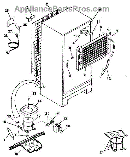 This is a compressor used in several types of home appliances. The compressor is designed to take cold gas in the appliance and place it under pressure so the gas raises in temperature. It is then moved through the refrigerator system to ensure the unit stays cold throughout the appliance. This part can become damaged or malfunction, which may cause the motor to stop running, make the motor noisier, or cause the motor to never stop running.If this happens, the compressor will need to be replaced. A basic set of tools will be needed. A pair of work gloves can also be useful. First, locate the compressor as it may be in various locations depending on the appliance model. Unplug the appliance before removing the compressor. Install the new compressor using the original bolts and nuts before turning the power back on and resuming normal use.This part is sold on an individual basis. The compressor is made to be used with refrigerators, ranges, stoves, ovens, air conditioners, and freezers created by Gibson, Frigidaire, Kelvinator, Montgomery Wards, Westinghouse, Tappan, JCPenney, Universal, and Kenmore. It is an authentic OEM replacement part directly sourced from the manufacturer.