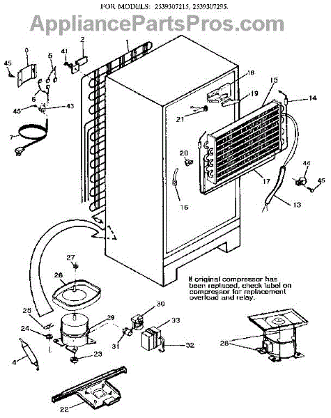This is a compressor used in several types of home appliances. The compressor is designed to take cold gas in the appliance and place it under pressure so the gas raises in temperature. It is then moved through the refrigerator system to ensure the unit stays cold throughout the appliance. This part can become damaged or malfunction, which may cause the motor to stop running, make the motor noisier, or cause the motor to never stop running.If this happens, the compressor will need to be replaced. A basic set of tools will be needed. A pair of work gloves can also be useful. First, locate the compressor as it may be in various locations depending on the appliance model. Unplug the appliance before removing the compressor. Install the new compressor using the original bolts and nuts before turning the power back on and resuming normal use.This part is sold on an individual basis. The compressor is made to be used with refrigerators, ranges, stoves, ovens, air conditioners, and freezers created by Gibson, Frigidaire, Kelvinator, Montgomery Wards, Westinghouse, Tappan, JCPenney, Universal, and Kenmore. It is an authentic OEM replacement part directly sourced from the manufacturer.