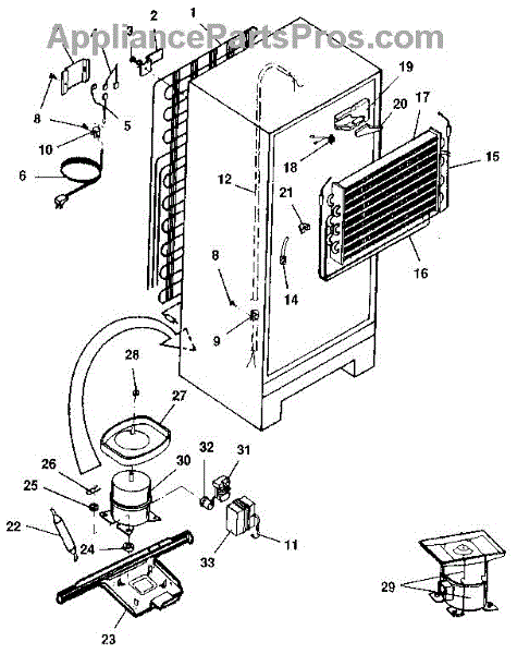 This is a compressor used in several types of home appliances. The compressor is designed to take cold gas in the appliance and place it under pressure so the gas raises in temperature. It is then moved through the refrigerator system to ensure the unit stays cold throughout the appliance. This part can become damaged or malfunction, which may cause the motor to stop running, make the motor noisier, or cause the motor to never stop running.If this happens, the compressor will need to be replaced. A basic set of tools will be needed. A pair of work gloves can also be useful. First, locate the compressor as it may be in various locations depending on the appliance model. Unplug the appliance before removing the compressor. Install the new compressor using the original bolts and nuts before turning the power back on and resuming normal use.This part is sold on an individual basis. The compressor is made to be used with refrigerators, ranges, stoves, ovens, air conditioners, and freezers created by Gibson, Frigidaire, Kelvinator, Montgomery Wards, Westinghouse, Tappan, JCPenney, Universal, and Kenmore. It is an authentic OEM replacement part directly sourced from the manufacturer.